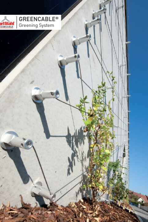 Greencable Greenery System unites high-tech with ingenious simplicity. It is comprised of 4mm stainless steel wire ropes and specially designed aluminum wall holders. Once the wall holders are installed, the vine support ropes are strung and tensioned by hand. This offers easy and quick installation of small and midsize façade greenery for both commercial and residential applications. It is appropriate for leaf stemmed climbers, scrambling plants and shooting climbers