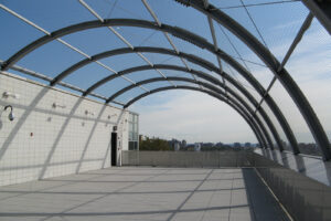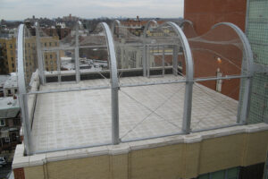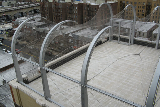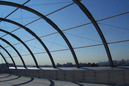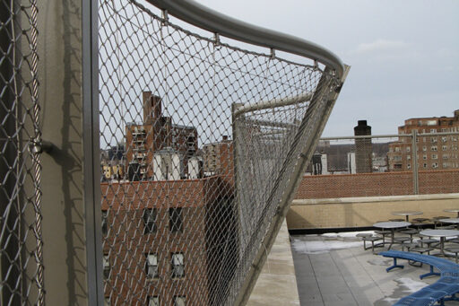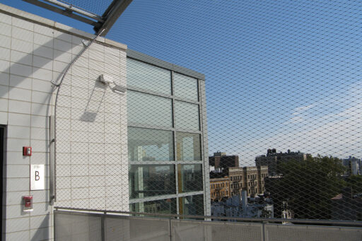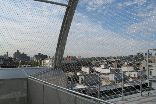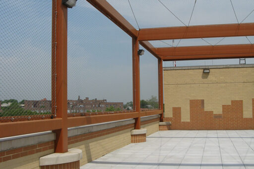 Our stainless steel cable mesh is increasingly used as transparent enclosures on rooftop patios and children's play areas. The mesh is not only suitable for stopping balls, but also serves as fall protection. Thanks to the transparent appearance of the cable mesh, the out-of-doors nature of the space is maintained. Because large dimensions of mesh are possible, relatively little steel construction is required, which means that the costs remain low. Below are several examples of our rooftop projects.