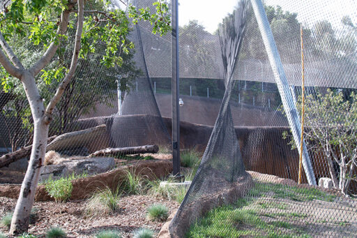 The Africa Rocks exhibit at the San Diego Zoo features an outdoor area with a mesh surface of about 6,500 square meters supported by nine steel pylons. A barely perceptible, filigree stainless steel cable mesh construction is the only separation between humans and animals. To create appropriate habitats for the various animals, exact planning, statical analysis, and on-site assembly were required.