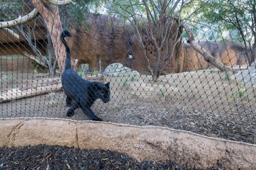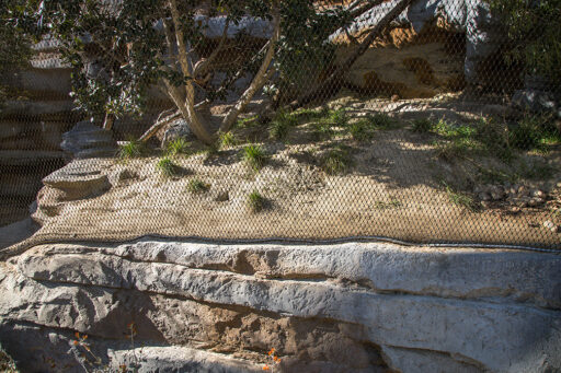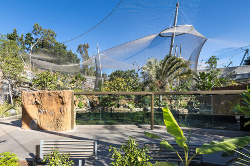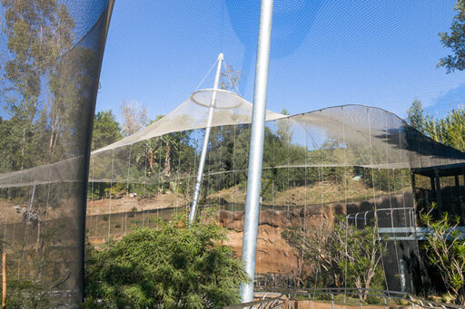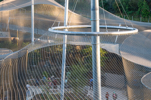 The Africa Rocks exhibit at the San Diego Zoo features an outdoor area with a mesh surface of about 6,500 square meters supported by nine steel pylons. A barely perceptible, filigree stainless steel cable mesh construction is the only separation between humans and animals. To create appropriate habitats for the various animals, exact planning, statical analysis, and on-site assembly were required.